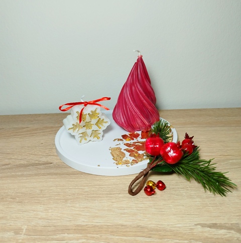 Χριστουγεννιάτικη σύνθεση αποτελούμενη από στρόγγυλο δίσκο πορσελάνης και δύο αρωματικά κεριά σε σχήμα δένδρου και χιονονιφάδας. Η διακόσμηση και τα αρώματα είναι δική σας επιλογή.