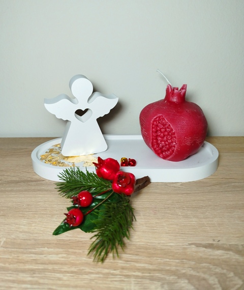 Χριστουγεννιάτικη σύνθεση αποτελούμενη από οβάλ δίσκο πορσελάνης μεγάλο, αγγελάκι από πορσελάνη και αρωματικό κερί σε σχήμα ρόδι. Η διακόσμηση και τα αρώματα είναι δική σας επιλογή.