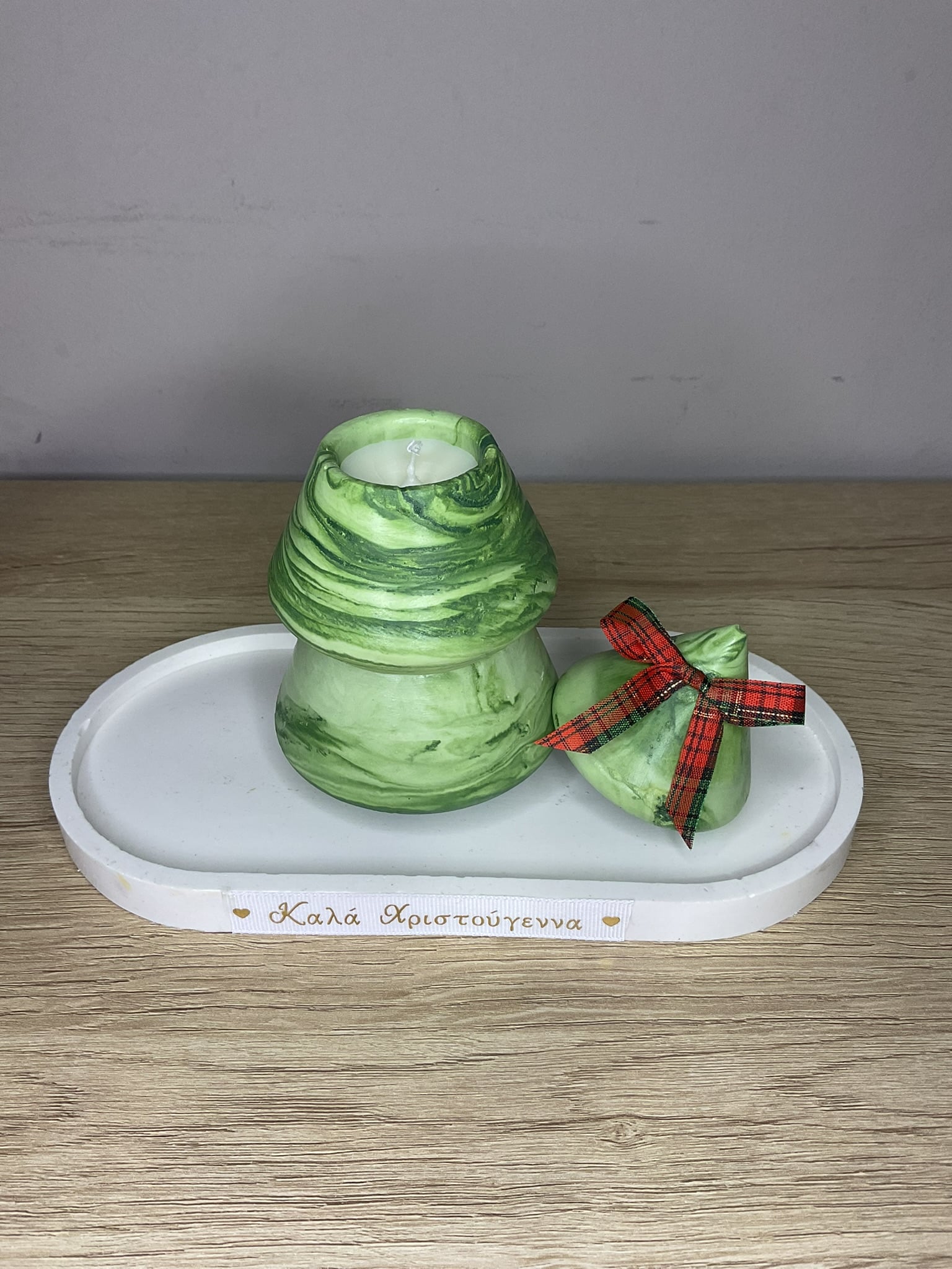 Τα χριστουγεννιάτικα κεριά σε σύνθεση αποτελούν μία από τις πιο εντυπωσιακές και ζεστές προτάσεις διακόσμησης για τις γιορτινές ημέρες. Η συγκεκριμένη δημιουργία συνδυάζει τρία ξεχωριστά, χειροποίητα κεριά τοποθετημένα πάνω σε μια κομψή, λευκή βάση που φέρει την ευχή «Καλά Χριστούγεννα». Η προσεγμένη αισθητική, οι γιορτινές λεπτομέρειες και η υψηλή ποιότητα κατασκευής κάνουν τη σύνθεση αυτή ιδανική για οποιοδήποτε σπίτι θέλει να αποπνέει ατμόσφαιρα ζεστασιάς και χαράς.
