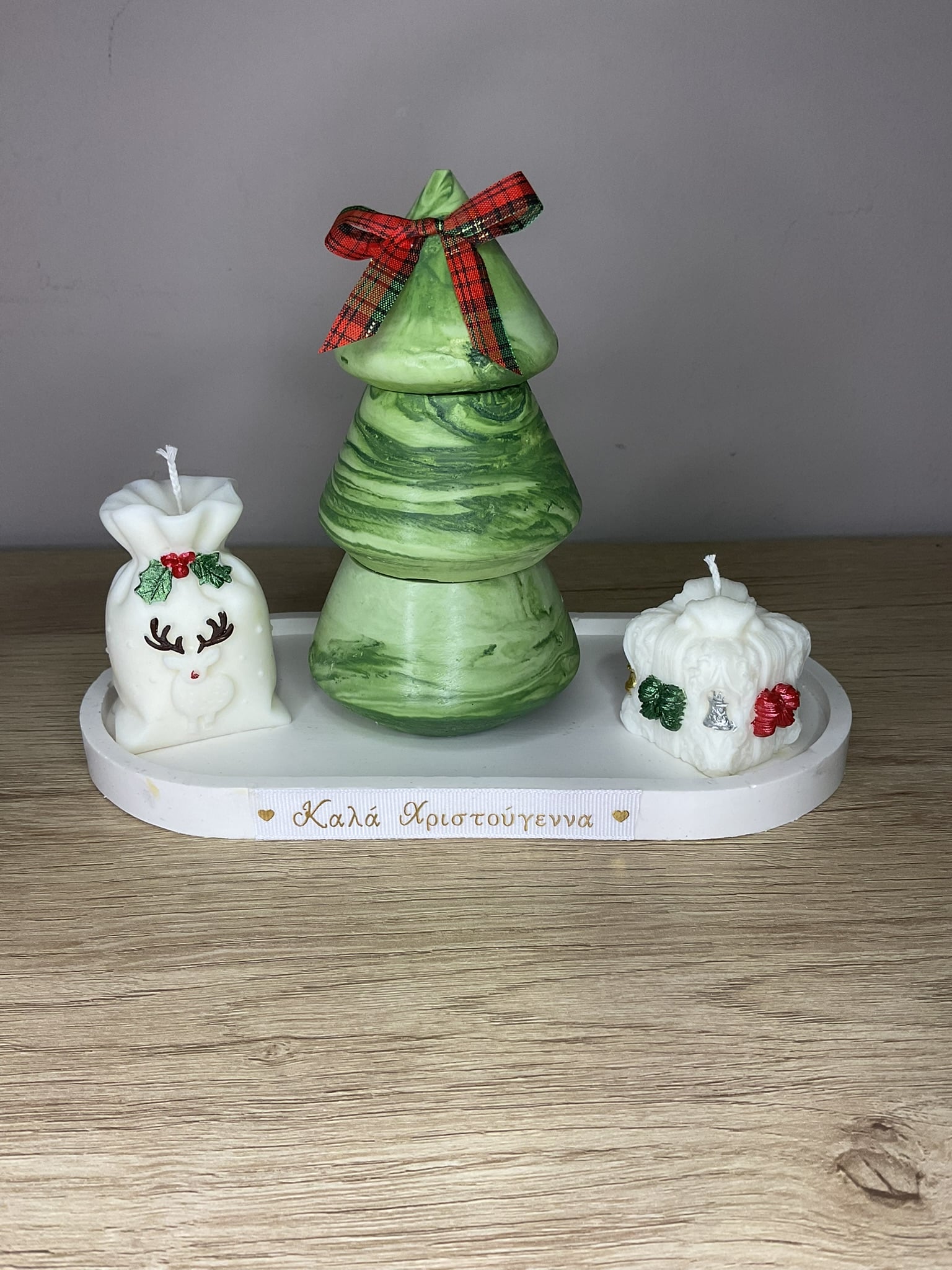 Το κεντρικό στοιχείο της σύνθεσης είναι ένα εντυπωσιακό πράσινο κερί σε σχήμα χριστουγεννιάτικου δέντρου, με όμορφα χυμένους χρωματισμούς και στολισμένο με μια παραδοσιακή κόκκινη καρό κορδέλα. Στα αριστερά βρίσκεται ένα μικρό λευκό κερί σε σχήμα πουγκιού, διακοσμημένο με χαριτωμένο πρόσωπο ελαφιού και λεπτομερείς γιορτινές πινελιές. Στα δεξιά ολοκληρώνει τη σύνθεση ένα λευκό ανάγλυφο κερί με πράσινες και κόκκινες χριστουγεννιάτικες λεπτομέρειες, δημιουργώντας μια απόλυτα ισορροπημένη και αρμονική εικόνα.